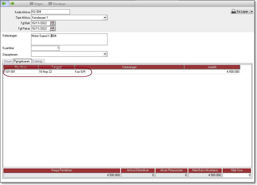 - Jika perusahaan melakukan pembelian aset tetap secara tunai maka cara inputnya di Accurate adalah dengan memakai modul [Asset Tetap] (lihat pembahasan di sini) dengan mengisi akun yang terdapat di tab [Pengeluaran] dengan akun yang digunakan untuk melakukan pembelian asset tersebut.