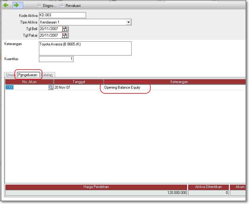 - Untuk detailnya lihat pembahasan di Formulir Aktiva tetap Baru, hanya saja untuk tab [Pengeluaran] Akunnya kita isi Opening Balance Equity.